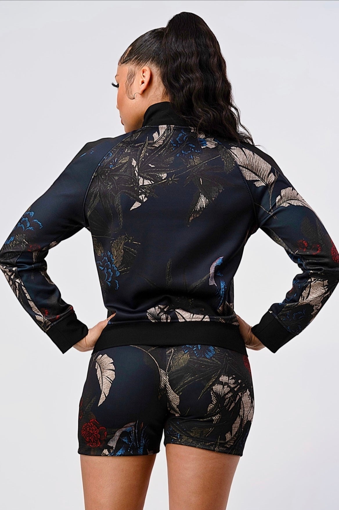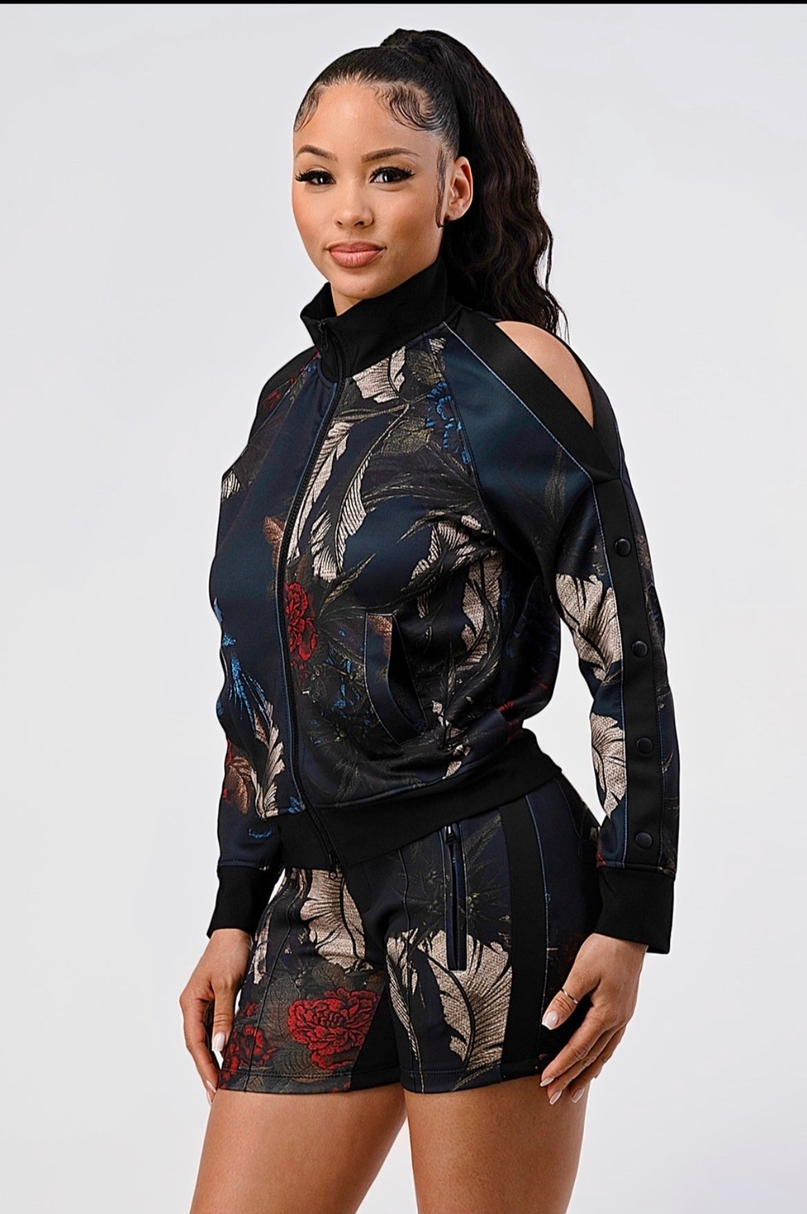 This flirty Comfortable multi climate multi purpose set adds flavor and a bit of sexy with a peep shoulder and high collar. Can be worn with a cute sneaker or heel. A must have.